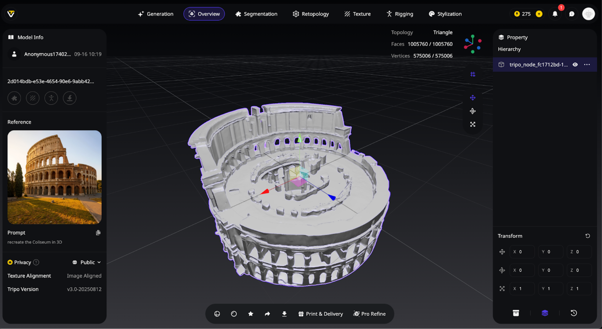 Through this partnership, we will work together to create a seamless pipeline from AI-generated 3D assets to fully deployed immersive experiences, accessible through anitya's browser-native platform and powered by Tripo's cutting-edge 3D AI generation capabilities. This partnership expands anitya's growing ecosystem of generative AI integrations, providing creators with even more powerful tools to bring their spatial visions to life.